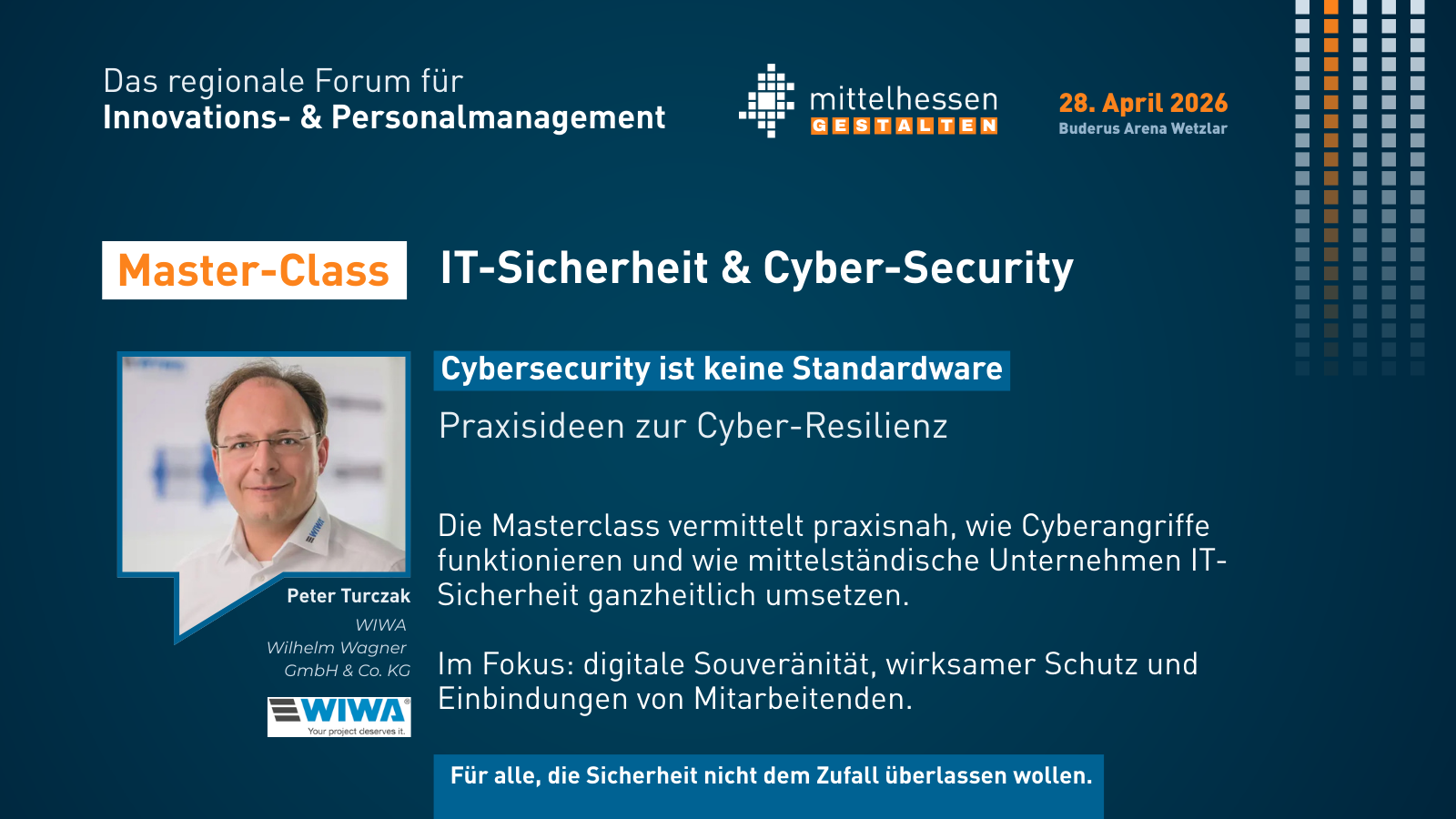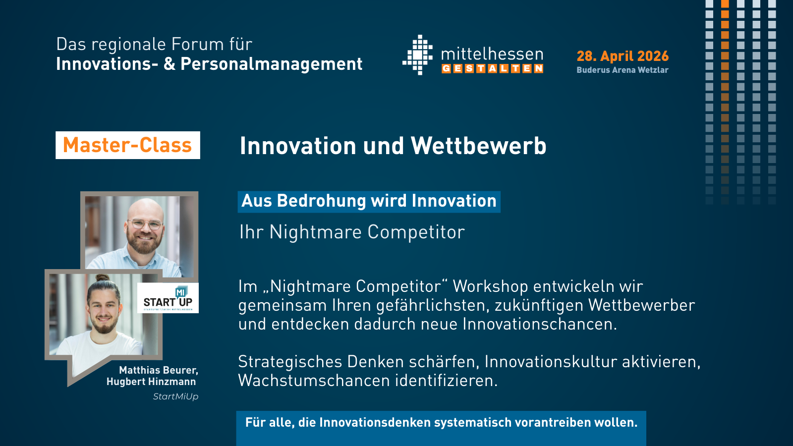 Das Forum für Innovations- und Personalmanagement bringt Geschäftsführung, Personalverantwortliche, Digitalisierungs- und Innovationsmanager zusammen. Soziale Innovationen und technische Innovationen müssen zusammengedacht werden. Die Veranstaltung bietet Keynote-Vorträge, Impuls-Sessions mit Good-Practice-Beispielen und Master-Classes zu Spezialthemen. Ziel ist es, Silos zwischen Personalarbeit, Digitalisierung und Forschung aufzubrechen und den Austausch der Akteure zu fördern. Die Region soll als dynamischer Innovationsstandort gestärkt werden.